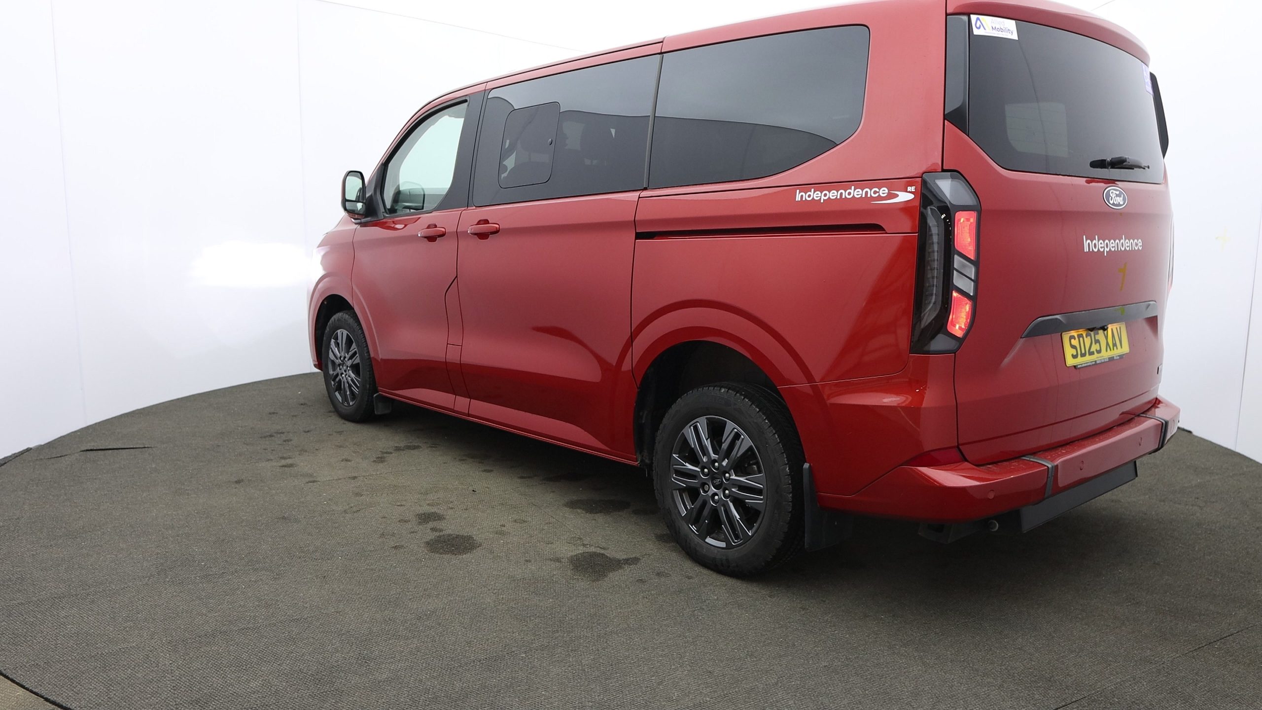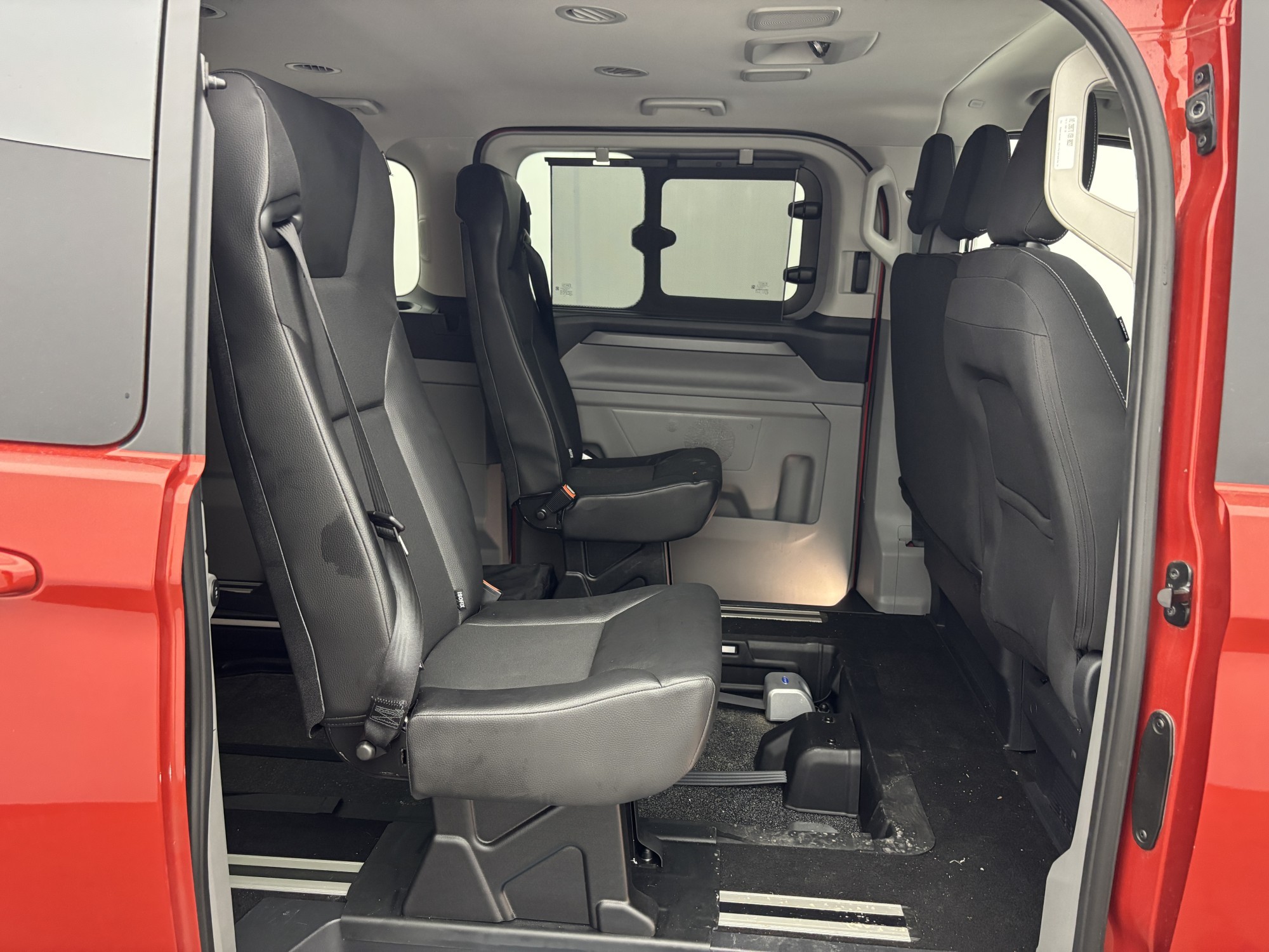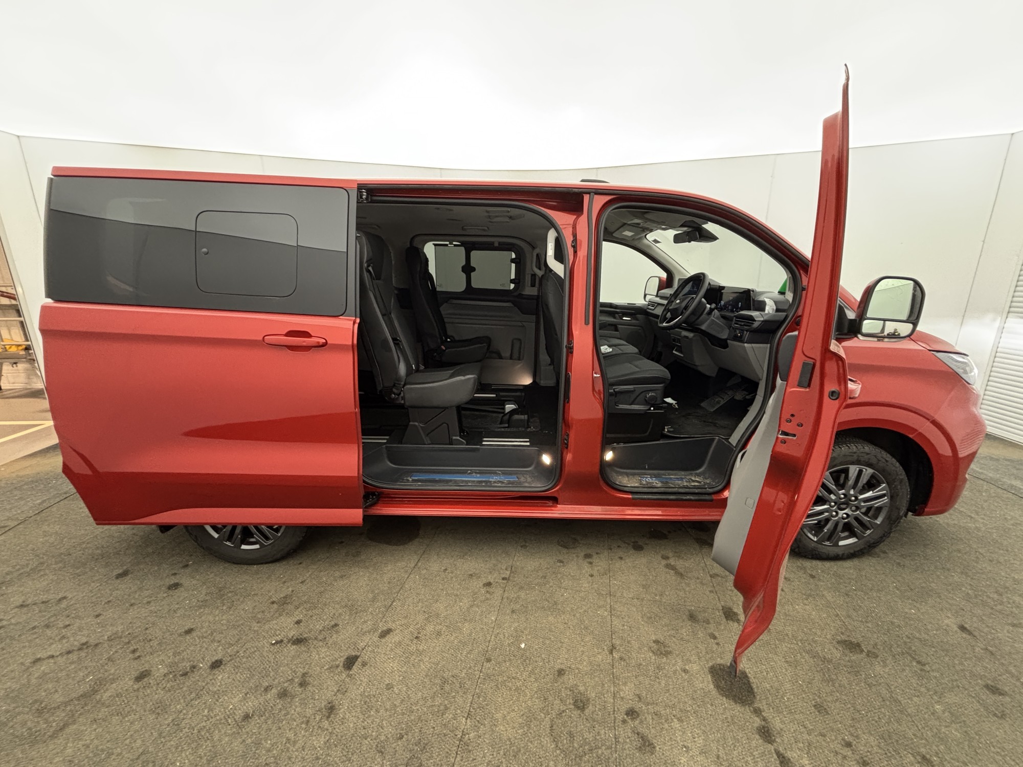 This metallic red automatic Titanium new shape Tourneo Custom with a full length lowered floor has 5 seats plus 1 wheelchair position.