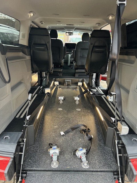 This metallic red new shape Tourneo Custom LWB with a full length lowered floor has 4 seats plus 2wheelchair positions.